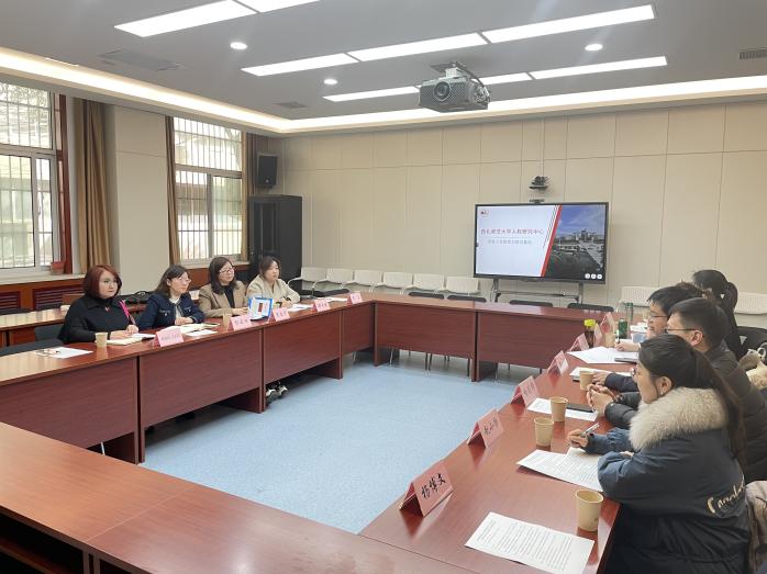 西北政法大学人权研究中心、陕西省铸牢中华民族共同体意识研究基地“法治与中华民族共同体建设研究中心”主任常安、校团委组织宣传部部长赵欣辰、中心主任助理哈冠群、研究员赵小静、杨博文、倪文艳热情接待来访人员并参与座谈。会前双方共同观看了人权研究中心宣传短片,常安从中心基础建设、学术成果、人才培养、咨政建言、国际交流与合作等方面作了详细介绍,他表示长安大学思创中心拥有资源优势,在实证研究方面取得了丰硕成果,希望后期能深化交流,开展深度合作。赵欣辰和赵小静分别介绍了学校的课程设置、中心的研究特色。