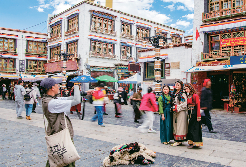 千年八廓街,见证民族团结。2021年7月,习近平总书记来到位于西藏拉萨老城区的八廓街,感慨地说:“千年八廓街,是我们各民族建起来的八廓街。各民族文化在这里交流交往交融,我们中华民族的大家庭在这里其乐融融。”图为2023年6月13日,游客身着藏装在八廓街拍照留念。 新华社记者 姜帆/摄