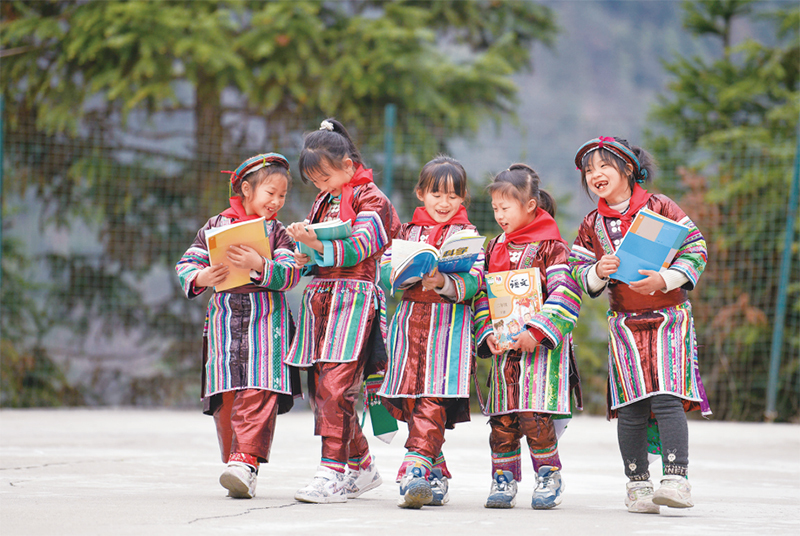 位于贵州省黔东南苗族侗族自治州从江县大山深处的西山镇中寨教学点,是一所全校均为瑶族学生的“微小学”。近年来,随着教学条件逐渐改善,学校发生了翻天覆地的变化。图为2023年2月16日,领到新书的瑶族学生在一起交流。 新华社记者 杨文斌/摄