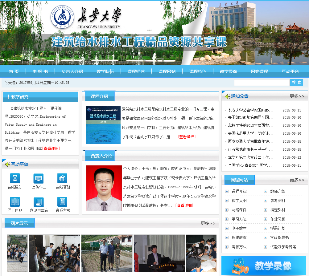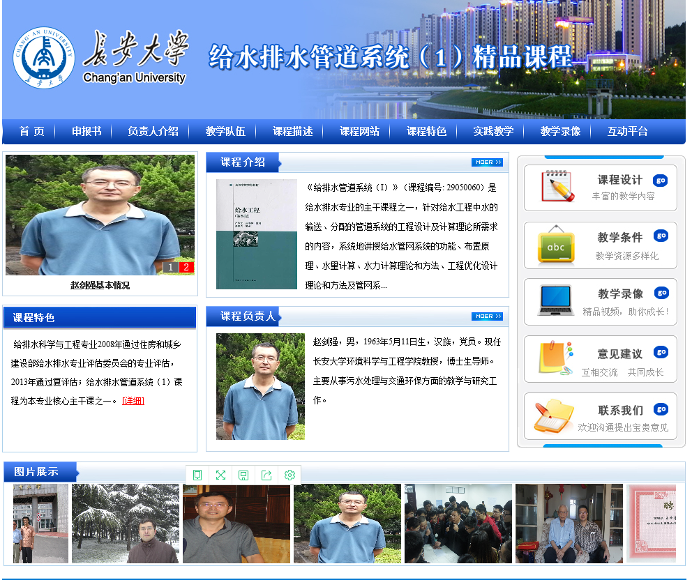 “建筑给水排水工程”是给排水科学与工程专业的主要专业课程之一,是一门为工业与民用建筑提供必需的生产条件和舒适、卫生、安全的生活环境的应用科学。其主要任务是介绍建筑内部的给水、消火栓给水、自喷给水、气体消防、排水、雨水、热水供应以及水景、游泳池给水排水、小区给水排水和中水工程的基本理论、设计原理、设计方法以及安装和管理等方面的基本知识,以及国内外建筑给排水工程的新技术、新概念。可以有效契合当今国家的智慧城市、绿色建筑、二次供水、建筑节水、节能、中水回用、建筑小区雨水利用、装配式住宅等主题。本课程也是专业特色选修课程“高层建筑给排水及消防工程”的基础。课程团队中教师教学、实践经验丰富,注重理论与实践相结合,获得过陕西省优秀设计二、三等奖5项,同时聘请6位国家甲级建筑设计院教授级高工担任授课和课程设计、毕业设计评阅审核教师,并与多个大、中型企业签署实习协议,为学生实践教学提供良好条件,同时也打下坚实的理论与实践基础。“建筑给水排水工程”课程体系为给排水科学与工程省级人才培养创新实验区的重要内容。