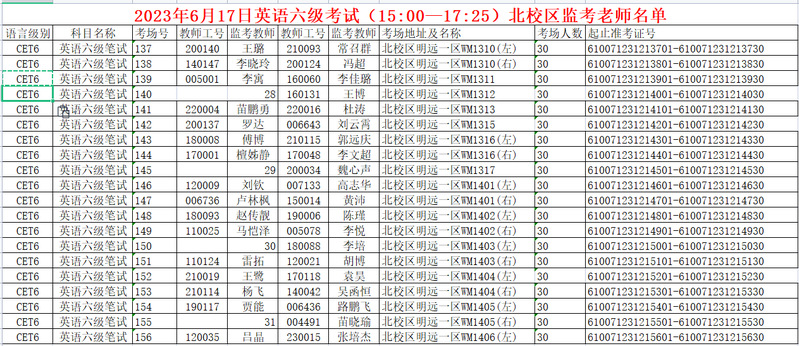 2023年6月17日全国大学生英语四六级考试(建工学院北校区)监考安排