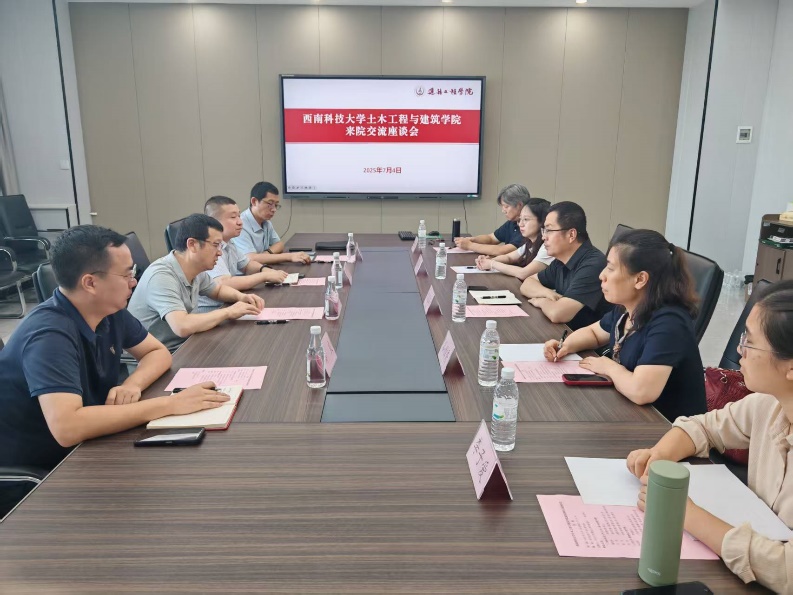 7月4日下午,西南科技大学土木工程与建筑学院党委书记陶俊林一行4人来我院调研交流。院长邢国华主持召开了座谈会,人工环境与能源工程系主任谷雅秀、副主任檀姊静、市政与暖通实验中心副主任赵凡、建环与市政联合党支部组织委员李子爱参加了座谈会。