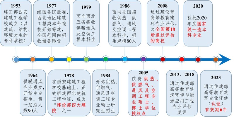 长安大学人工环境与能源工程系(以下简称“环能系”)始建于1964年,并于同年开始本科招生,1984年起招收硕士研究生。2005年获批“供热、供燃气、通风及空调工程”硕士及博士学位授权点,2008年通过全国高等教育建筑环境与设备工程专业评估,成为国内第18所通过该评估的高校,并于2013年、2018年和2023年三次顺利通过复评。2020年,本专业入选教育部“双万计划”国家级一流本科专业建设点。自成立以来,本系始终担任全国高等学校建筑环境与能源应用工程专业教学指导分委员会委员单位,持续引领专业教育发展。