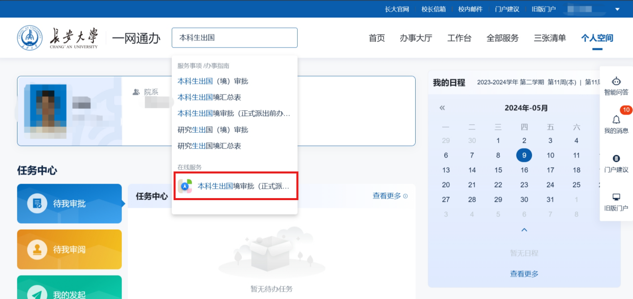 第一步:信息门户-个人空间-搜索“本科生出国”/“研究生出国”-点击进入。