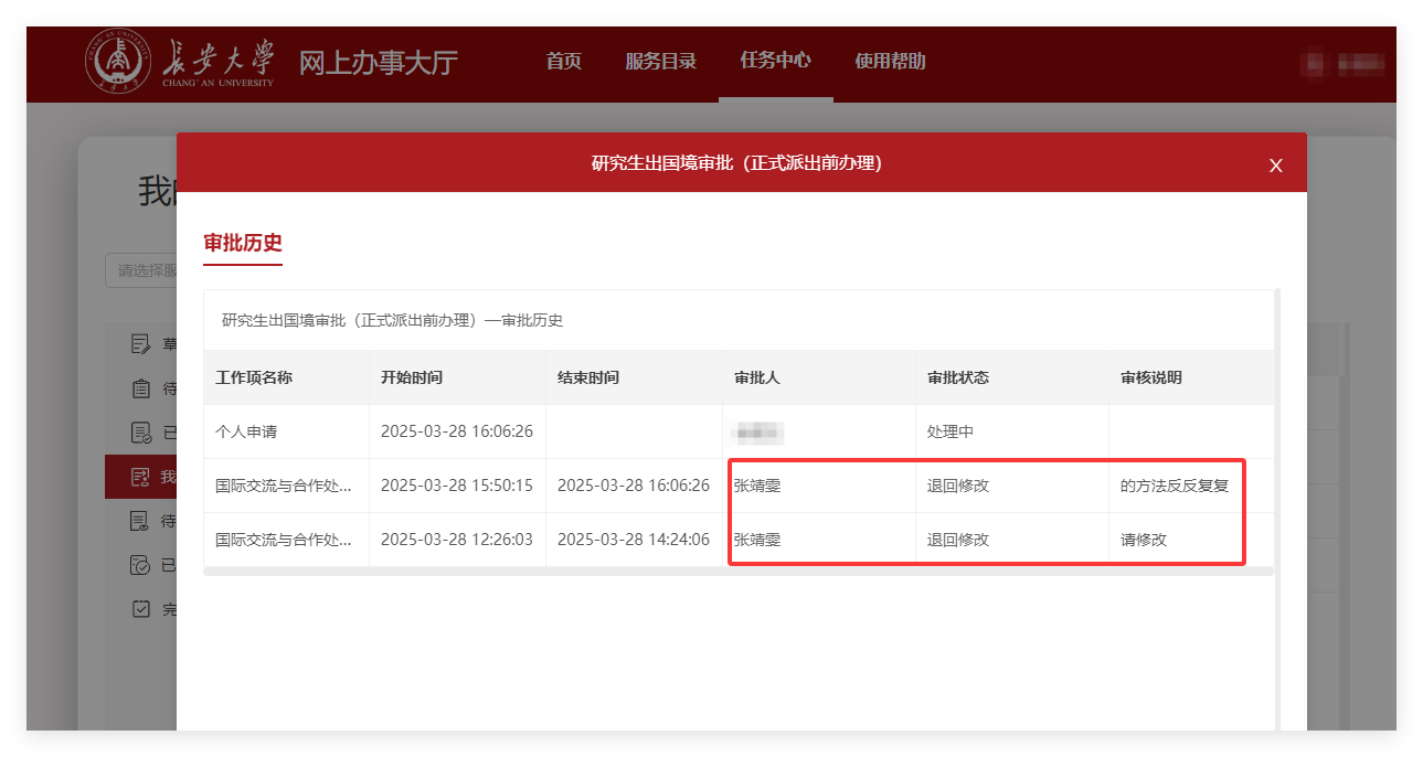 第五步:查看审核说明,若有退回修改则按照修改意见重新修改提交,直至整个流程完成。