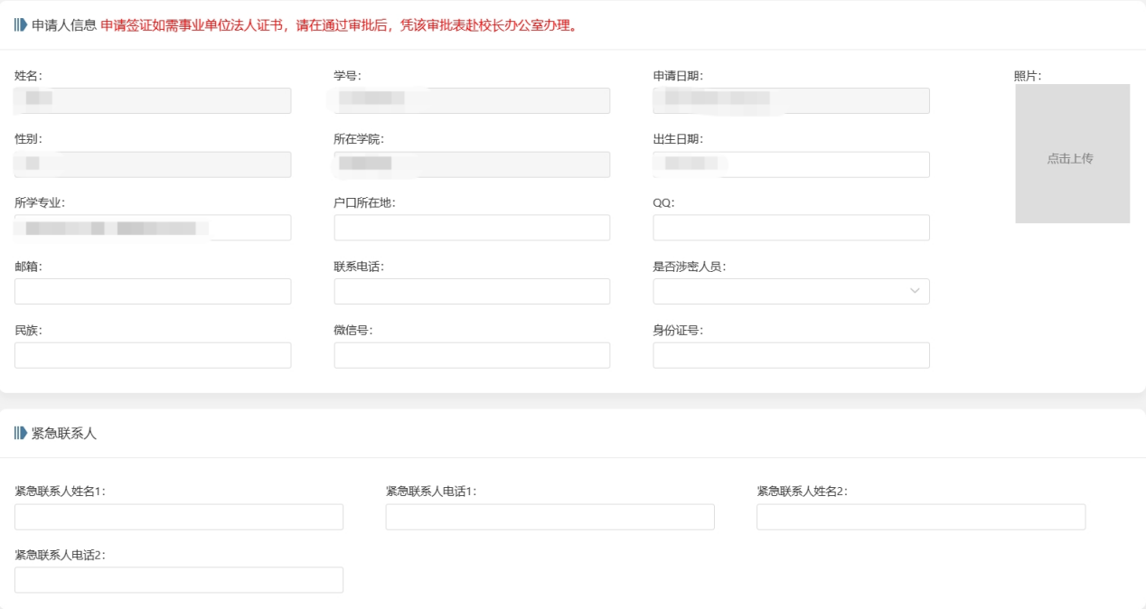 第二步:完善申请人信息、紧急联系人信息、出国信息、附件上传等。