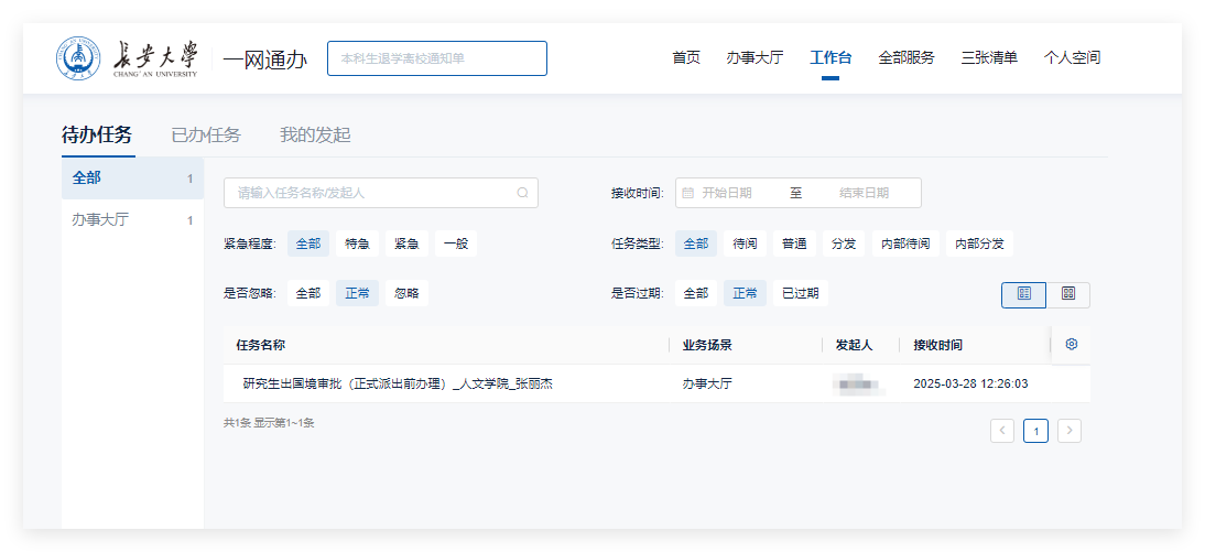 第四步:我的发起-找到研究生出国境审批(正式派出前办理)-最右侧点击“进度”。