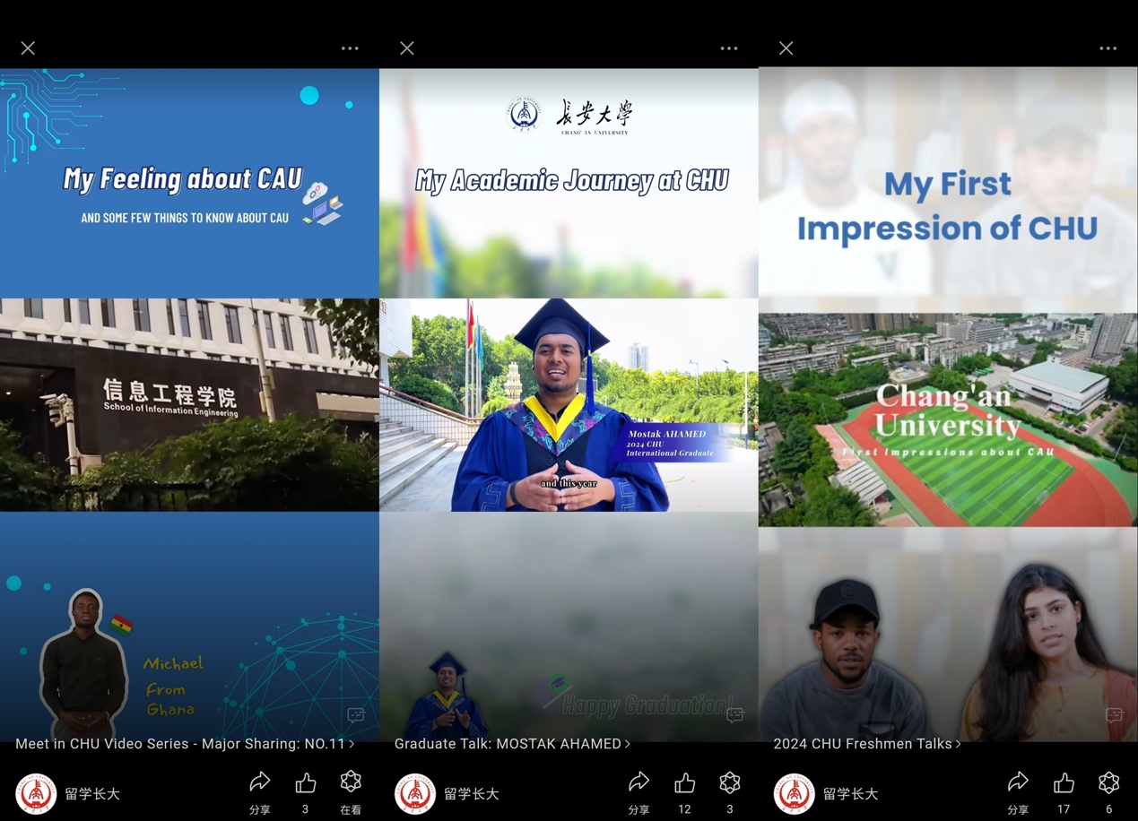 2024年,“留学长大”本着立足国际学院特色,结合校园动态,放眼国际平台的原则,于2024年推出由国际学生出镜创作的视频内容共30篇,分为“Meet in CHU Video Series”、“Graduate Talk”、“2024 CHU Freshmen Talks”三大专栏,每期由一位国际学生围绕学校印象、专业分享、学习体验等内容进行口播分享,并配合内容剪辑学校的场景形成vlog。以上专栏同时在我校Facebook、Instagram、Youtube和Tik Tok 四大平台海外社交媒体发布,获得了一致好评,全球总播放量过数十万,并助力我校2023中国内地大学海外网络传播力综合指数总排名上升至第三十五名。长安大学Instagram位居2023中国内地大学海外网络传播力综合指数各平台第十名。2024年利用Facebook、Instagram、TikTok、YouTube等平台共发布推文524篇,曝光量为4,753,238次,链接点击量30,468次, 四个平台总粉丝为134,755人,新增粉丝46,768人。