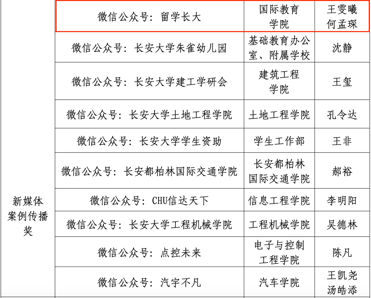 为深入贯彻落实习近平文化思想和全国全省宣传思想文化 工作会议精神,牢牢把握新时代新的文化使命,整体提升创新理论引领力、宣传思想凝聚力、新闻舆论传播力、先进文化助推力,推动学校宣传思想文化工作取得新成就、展现新风貌,自2024年11月起,在全校范围内开展2024年优秀校园新媒体评选活动。经过自愿申报、推荐审核、WCI与BCI指标综合评选、网络文化建设与管理工作领导小组审议等环节,“留学长大”微信公众号荣获长安大学2024年新媒体案例传播奖。