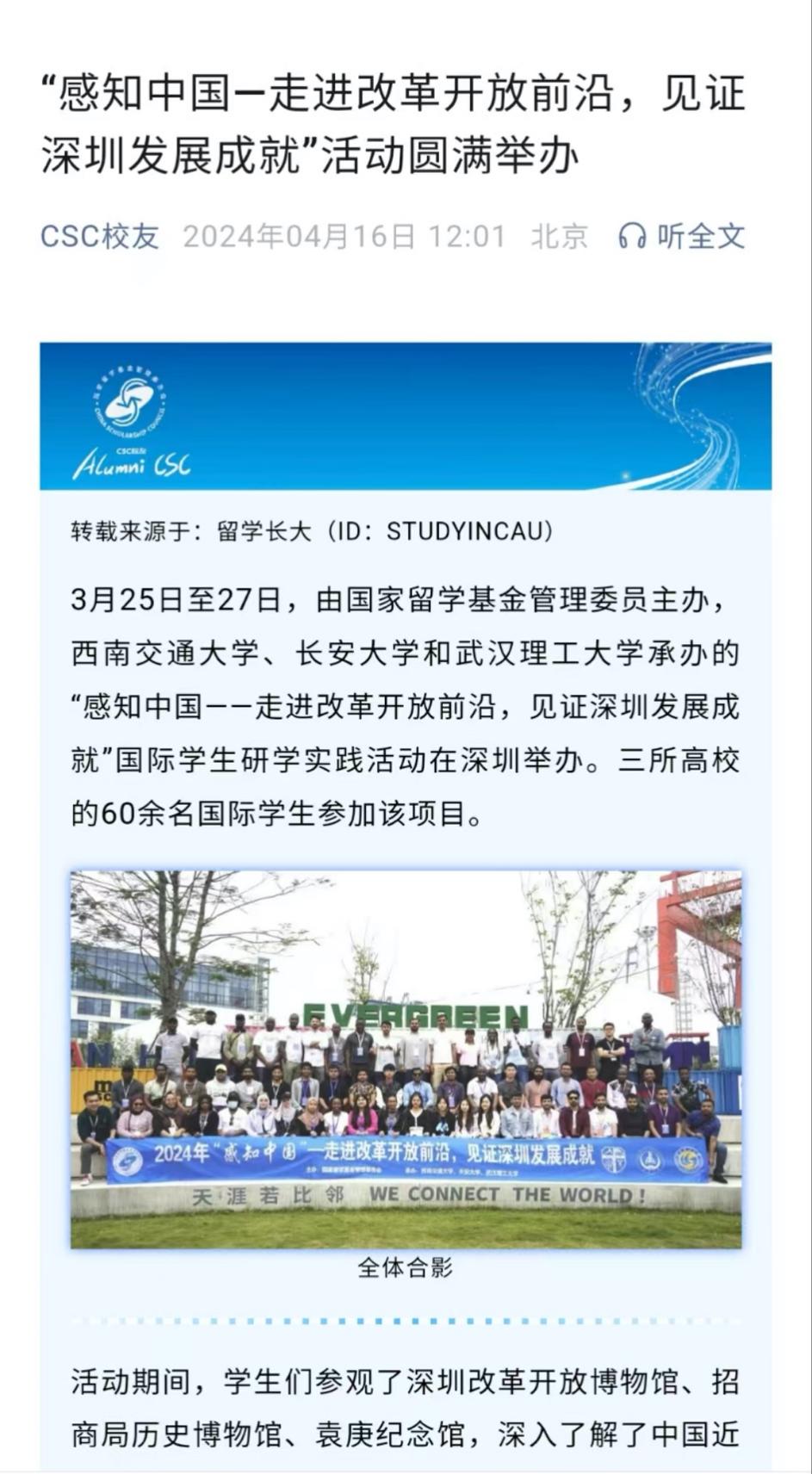 2024年4月1日发布的推文《我校优秀国际学生参加国家留学基金委“感知中国”实践活动》被“国家留学基金管理委员会”官方微信公众号转载。
