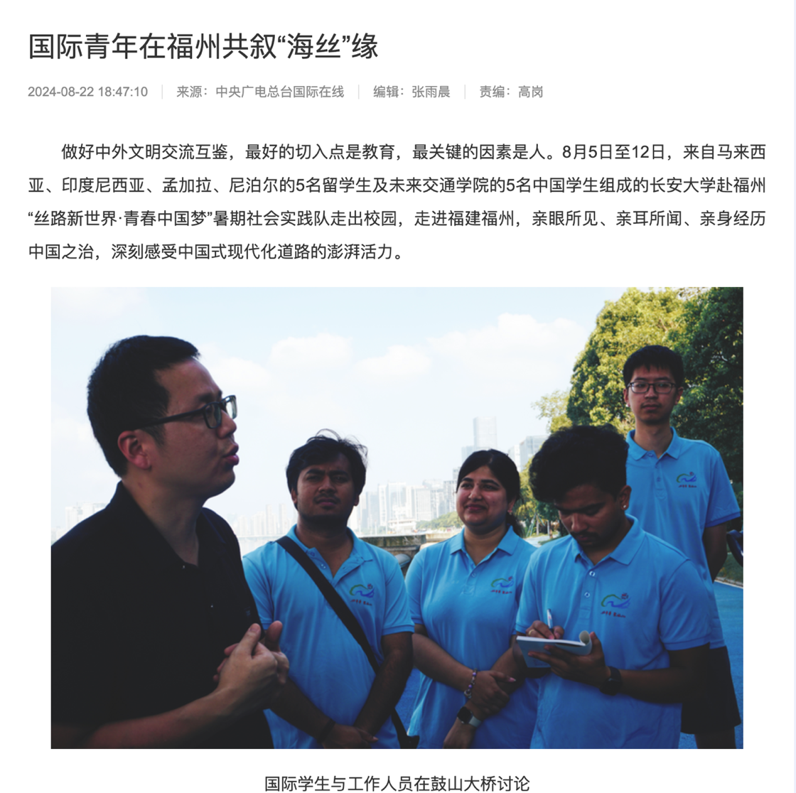 截至2024年12月30日,“留学长大”微信公众号共发布国际学生社会实践相关推送共18篇,总阅读量高达万余次。其中,2024年8月23日发布的《国际青年在福州共叙“海丝”缘》推文在中央广电总台国际在线转载,阅读量9.7万。该实践队获得“长安大学2024年暑期社会实践活动优秀成果”,两名实践队国际学生获得“2024年暑期社会实践活动先进个人”,实践队指导教师郝裕“2024年暑期社会实践活动优秀指导教师”。