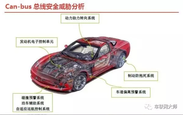 Can-bus总线安全威胁 汽车电子元器件是通过CAN网络连接的,电子元器件之间通过CAN包进行通信。Can-bus总线安全威胁通过逆向工程、模糊测试等方法获得其通信矩阵并破解汽车的应用层总线协议,在不增加汽车执行器的情况下实现对汽车的自动控制功能。也就是说,只要抓住了CAN总线,我们就相当于是抓住了汽车的神经,就能对汽车进行控制。