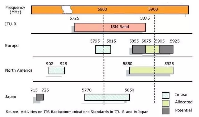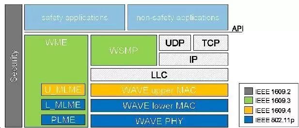 全球DSRC的频谱分配情况 在美国,标准化DSRC无线电技术的最初努力一个美国测试和材料协会(ASTM:American Society for Testing and Materials)的工作组中进行。在2004年,由于DSRC无线电技术迁移到IEEE 802.11标准组中,因为两者的工作高度类似。 IEEE 802.11 DSRC被称为IEEE 802.11p WAVE。 IEEE 802.11p不是独立的标准。它旨在修改整个IEEE 802.11标准。 将DSRC无线电技术标准移动到IEEE 802.11领域的一个特殊含义是,现在WAVE完全旨在作为适用于世界其他地区以及美国的国际标准。IEEE 802.11p标准旨在: 描述满足WAVE要求的站点在快速变化的环境中运行所需的功能和服务,以交换消息。 定义由IEEE 802.11 MAC控制的WAVE信令技术和接口功能。 2、IEEE 1609 IEEE 1609系列标准定义了以下部分: 架构; 沟通模式; 管理架构; 安全机制和在车辆环境中高速(<27 Mb / s),短距离(<1000m)和低延迟无线通信的物理访问。 这些标准定义的主要架构组件是车载单元(OBU:On Board Unit),路侧单元(RSU:Road Side Unit)和WAVE接口。 3、SAE J2735 与车辆通信相关的第三个重要标准是由汽车工程师协会(www.sae.org)维护的J2735专用短距离通信(DSRC)消息集词典( Message Set Dictionary)。 该SAE标准规定了专门用于使用(DSRC / WAVE)通信系统的应用程序使用的消息集,其数据帧和数据元素。 因此这个标准的范围集中在DSRC的消息集和数据帧上。 这个标准还规定了确定的消息结构,并从根据DSRC标准执行消息的应用程序开发人员的角度提供了足够的背景信息,以便正确解释消息定义。 第四个标准即3GPP的基于蜂窝的C-V2X 标准以后在专门介绍; V2V的应用