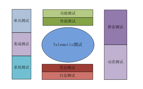 图1 Telematics系统架构 车载信息终端:采集CAN网络数据及GPS数据等信息,经过处理打包,通过无线通信网络传送给后台信息服务平台。 无线通信网络:应用3G/4G、Wi- Fi等现代网络通信的技术与手段,实现车载终端与后台服务平台的信息传输。 后台信息服务平台:借助互联网技术整合第三方内容和数据并对海量信息进行融合处理,以实现车辆检测、道路救援、实时交通、网上预约等服务与应用。 2.Telematics测试技术 2.1 Telematics系统特点 • 车载信息终端集成多种通信与数据IO硬件,并提供对多种通信协议、数据处理及应用服务的支持,系统非常复杂。 • Telematics具有多设备组成性,涉及众多厂商,信息数据流转链路复杂、网络异构且涉及海量信息整合,数据挖掘、大规模数据计算。 • 实时性、可靠性要求:网络节点(车辆)具有高动态性、拓扑变化频繁,且受到的干扰因素较多包括路边建筑物、天气状况、道路交通状况等。 2.2 Telematics测试方法 Telematics系统的复杂性决定了测试过程必需从多角度、多维度对系统进行综合性测试,主要测试技术如图所示,