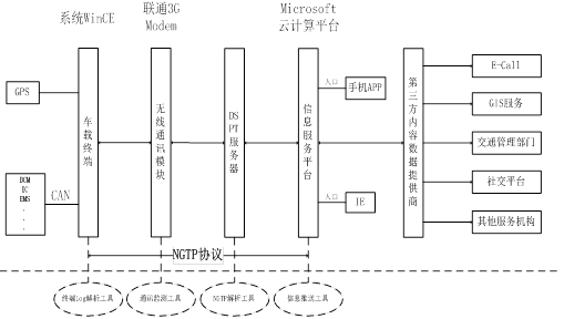 图4 Telematics测试策略分析 3.测试案例 某合资厂某车型Telematics系统级测试,该系统采用NGTP架构,车载终端为WinCE系统与车身BodyCAN链接并集成GPS通讯模块;无线通讯modem通过嵌入SIM卡接入中国联通3G网络,后台服务平台为Microsoft 云计算平台,并接入第三方服务机构如E-call。整个系统采用松耦合设计,可扩展性比较高。 3.1系统介绍 1、系统结构