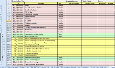 图8 测试用例开发 3.3测试环境搭建 测试环境主要分为两部分:实验室台架测试见图6、道路实车路试见图7。 实验室台架测试环境:BCM与IC为真实控制器,其余(含PTCAN)控制器为CANoe模拟,车载终端与IC由privateCAN连接,车载终端外接GPS天线与3Gmodel。 道路实车测试携带独立导航仪、GPS定位仪、联通3G手机等辅助设备对实时行车信息进行验证。
