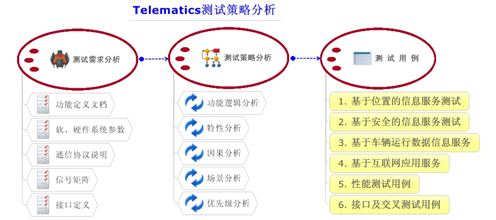 图3 Telematics 测试流程 测试策略分析以测试需求说明为输入,通过对功能逻辑分析、特性分析、因果分析、场景分析、优先级分析等加工输出系统测试用例。