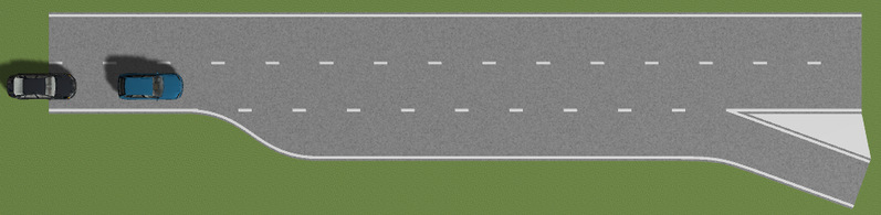 测试道路由测试车道、减速车道以及匝道组成,测试车道和减速车道间为白色虚线,测试车辆跟随前方参考车在行车道沿车道中线行驶,参考车减速驶入减速车道,测试车辆预期合理跟车控制,并保持车道线内沿车道中线行驶,最终实现直线道路自由匀速循线行驶。