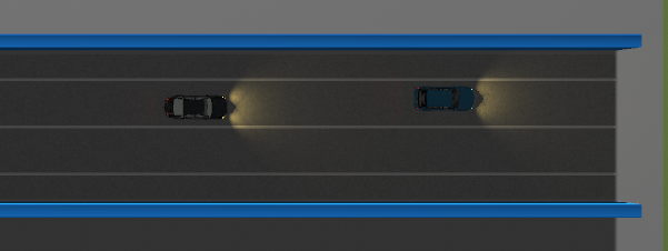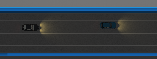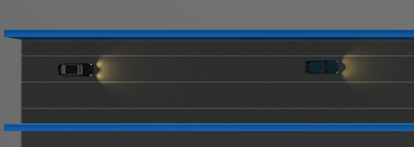 在模拟高速公路测试环境中,测试道路为至少包含两条车道的隧道道路(含隧道入口及上游道路、隧道出口及下游道路),隧道内道路中间车道线为白色实线,参考车辆沿车道线行驶,测试车辆应调整自身车速,建立或保持跟随参考车行驶。