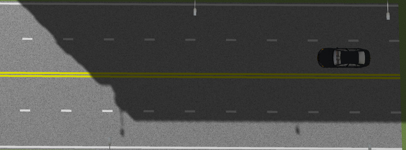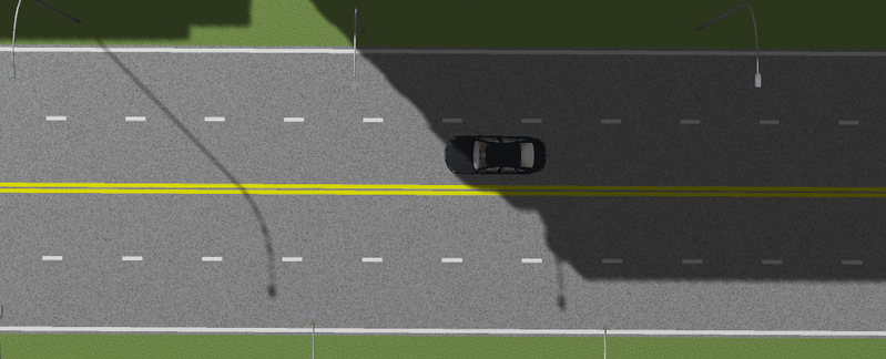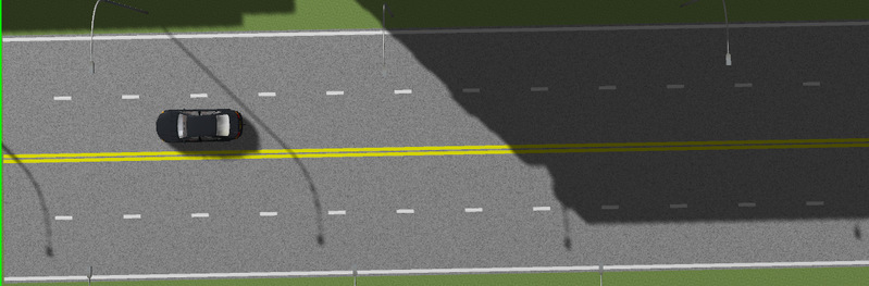 在模拟城市道路测试环境中,测试道路为两侧车道线为实线或虚线的直线道路(或大半径曲线道路及其组合),测试车辆沿车道线行驶,实现直线道路循线行驶。