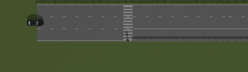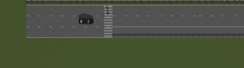 测试道路为双向4车道以上模拟城市车道(双向道路中央存在隔离带),中间车道线为白色虚线,测试车辆沿车道线行驶。模拟行人/非机动车在路侧通过人行横道横穿测试道路。
