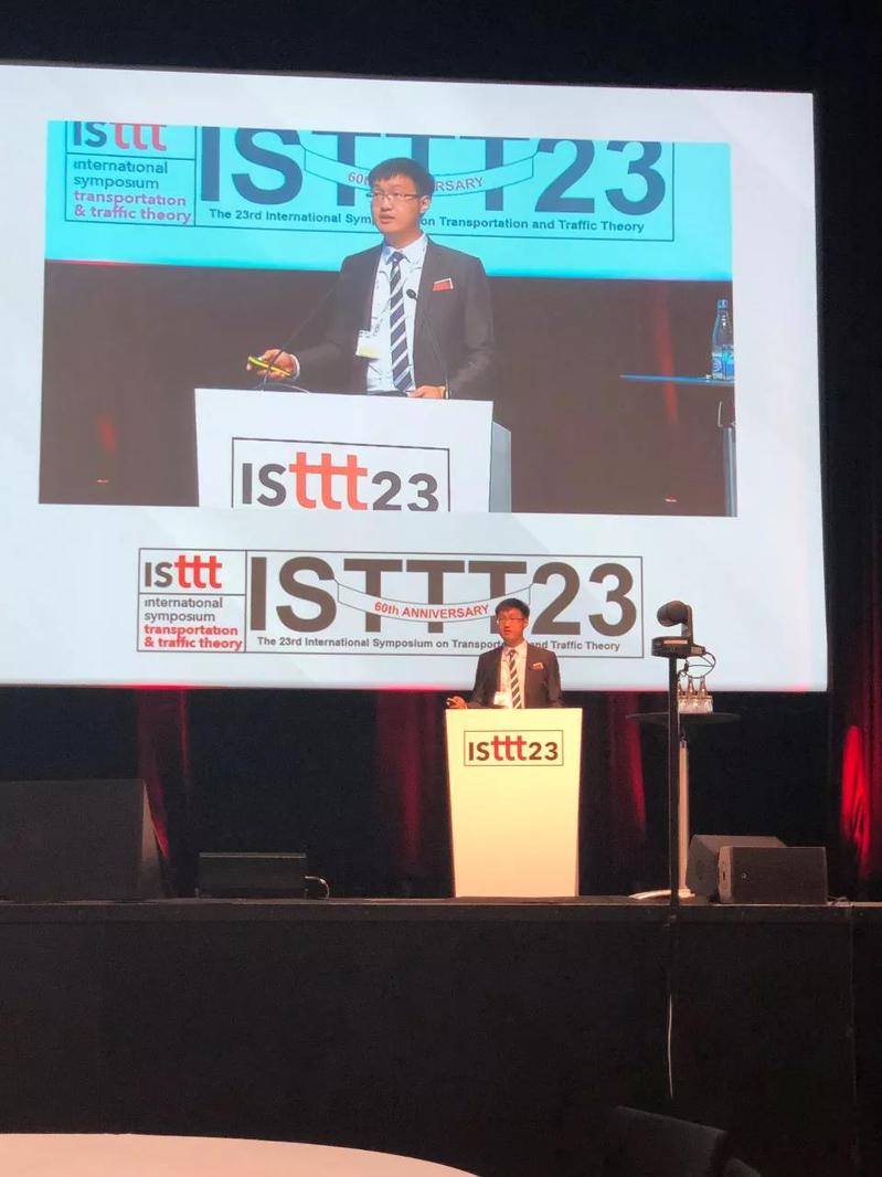 ISTTT是国际交通领域公认的顶级会议,有着60年的历史和极高的国际影响力,近年来被收录的会议论文均发表在Transportation Research Part B/PartC等交通领域顶级期刊上。本次会议共吸引了来自全球顶级研究小组的超过250篇投稿,最终确定33篇大会报告和15篇海报展示。龚思远副教授在会上做了题为“Cooperative Adaptive Cruise Control for Connected Autonomous Vehicles by Factoring Communication-Related Constraints”的大会报告。本研究针对真实环境中车辆队列控制算法所必须面对的瞬时通讯失败及信息拓扑动态变化等问题,提出了考虑通信因素的协同自适应巡航系统。通过系统上层基于通讯功能激活状态主动控制的动态拓扑优化模型,以及系统下层基于时变拓扑的被动自适应CACC控制器,从主被动两个方面降低通讯失效概率,提升智能网联车队列控制的稳定性表现。