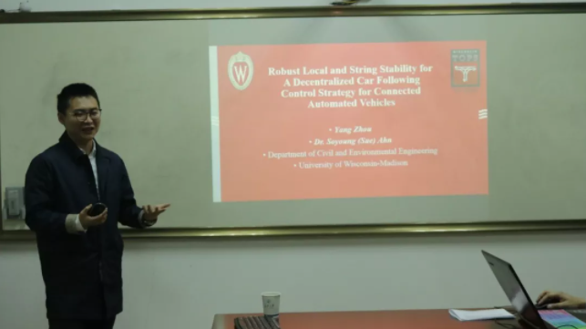 SoyoungAhn副教授做专题讲座 晚7时,周扬博士在信息学院四楼会议室为基地青年教师、博士生和硕士生做了题为《Robust Local and String Stability for a Decentralized Car Following Control Strategy for Connected Automated Vehicles》的专题报告。该报告展示了周扬博士最新的“基于动态时变机械控制延误和通讯延误的离散智能网联车控制方法”,研究了在机械延时和通讯延时不确定的环境下,如何建立智能网联车控制模型,合理推定控制参数可行域等。周扬博士与在场师生就测试场智能网联车的实际控制问题进行了深入的研讨。现场气氛热烈,学术氛围浓厚,讨论热烈。