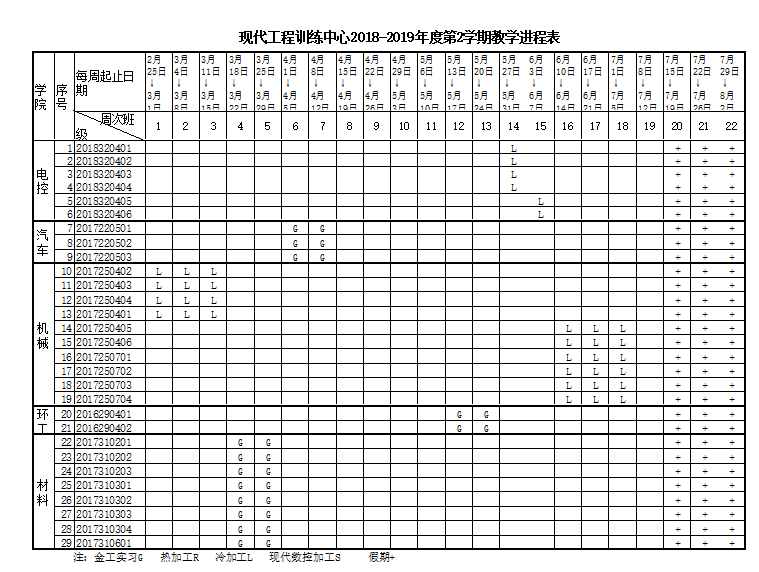 现代工程训练中心2018-2019年度第2学期教学进程表