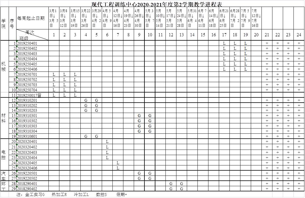 现代工程训练中心2020-2021年度第2学期教学进程表