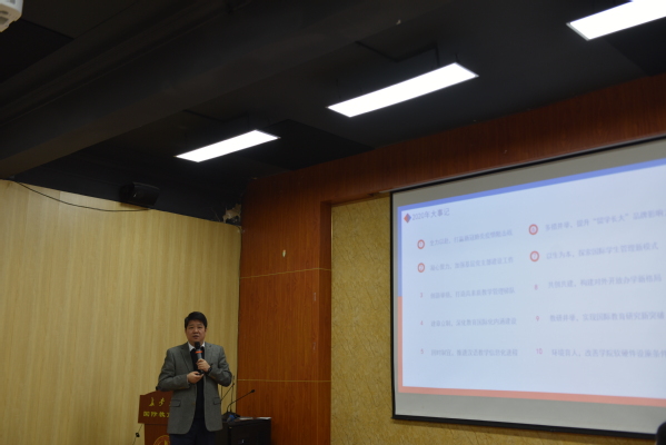 The Dean Mr Zhang Wei summarized the work of the college in 2020 and arranged the development plan of the college in 2021. He fully affirmed the contribution of all the staff to the development of the college and thanked the staff for their hard work. In the past year, all the teaching staff of the college have worked together to overcome many difficulties, expand the scale of the college, strengthen the teaching staff, and the college has achieved great development. The epidemic situation has won a stage victory, the international student enrollment has risen against the trend, the Chinese teaching information process has been continuously promoted, the foreign cooperation in running a school has made a breakthrough, and the foundation for the development of international education has been further consolidated. Looking ahead to 2021, the task remains arduous. The college will take "one core, two priorities, three advances and four special projects" as its starting point in order to grasp, forge ahead, and strive to do a good job in international education, constantly improve our international popularity and competitiveness, and steadily advance our internationalization strategy.